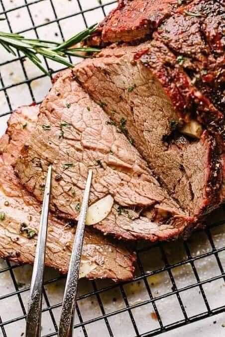![]() عرق الروستو :- المطبخ الفرنسى مكونات تتبيل اللحم: - 1 عرق لحم بقرى بحجم 1 ½ كيلو. - 2 ملعقة كبيرة مسطردة (خردل). - 1 ملعقة كبيرة أوراق زعتر طازج مفرية. - 1 ملعقة كبيرة أوراق روز مارى (إكليل الجبل) مفرية. - 2 ملعقة كبيرة أوراق بقدونس (معدنوس) مفرى ناعماً. - 1 ملعقة كبيرة زيت زيتون. - 2 ملعقة صغيرة ملح. - 1 ملعقة صغيرة فلفل أسود. ~~~~~~~~~~~ مكونات الصينية: - 20 حبة بطاطس (بطاطا) صغيرة الحجم. - 2 بصلة متوسطة الحجم. - 2 عود كرفس كبير الحجم. - 2 حبة جزر كبيرة الحجم. - 5 فصوص ثوم كبيرة الحجم. - 1 كوب ماء. ~~~~~~~~~~~ طريقة تتبيل اللحم: 1- يُمسح عرق اللحم بورق المطبخ، ثم يُربط بخيط كتانىِ سَميك (دُبارة) للحفاظ على شكله الإسطوانىِ أثناء الطهىِ. 2- يُسخن الفرن على حرارة متوسطة. 3- يمكن الإستعانة بالأعشاب الجافة بدلاً من الطازجة. 4- تُسكب المسطردة فى وعاء صغير، ويضاف إليها الزعتر والروز مارىِ والبقدونس والملح والفلفل الأسود والزيت، ثم تُخلط المكونات معاً جيداً. 5- يُفرد خليط التتبيل على إسطوانة اللحم بالكامل بواسطة فرشاة دهان صغيرة أو باليد. ~~~~~~~~~ طريقة عمل الصينية: 1- تُغسل حبات الجزر وتُقطع إلى مكعبات كبيرة الحجم، ثم توضع فى صينية فرن كبيرة الحجم. 2- تُغسل أعود الكرفس وتُقطع إلى شرائح كبيرة الحجم، ثم تضاف إلى الصينية. 3- تُقشر حبات البصل وتُقطع إلى مكعبات كبيرة الحجم، ثم تضاف إلى الصينية. 4- تُغسل حبات البطاطس وتُقطع إلى نصفين، ثم تضاف إلى الصينية وتُخلطالخضروات جيداً، وتُفرد على القاع. 5- تُنثر حبات الثوم والماء على خليط الخضروات فى الصينية، ثم تُوضع إسطوانة اللحم فوق الخضروات، وتُغطىَّ الصينية بإحكام بورق الألومنيوم. 6- تُترك صينية اللحم فى الفرن لمدة 90 دقيقة، ثم يُرفع عنها ورق الألومنيوم وتترك لمدة 30 دقيقة أو حتى يَنضج اللحم ويَأخذ اللون البُنىّ الداكن. 7- تُخرج الصينية من الفرن، وتُرفع إسطوانة اللحم من الصينية وتُترك جانباً حتى تَبرد قليلاً، ثم يُرفع عنها الخيط وتُقطع إلى شرائح رفيعة. 8- يُقدم اللحم الروستو ساخناً أو بارداً مع الخضروات والأرز. ~~~~~~~~~~